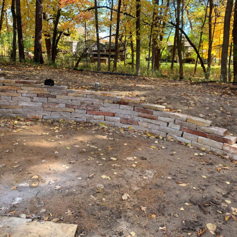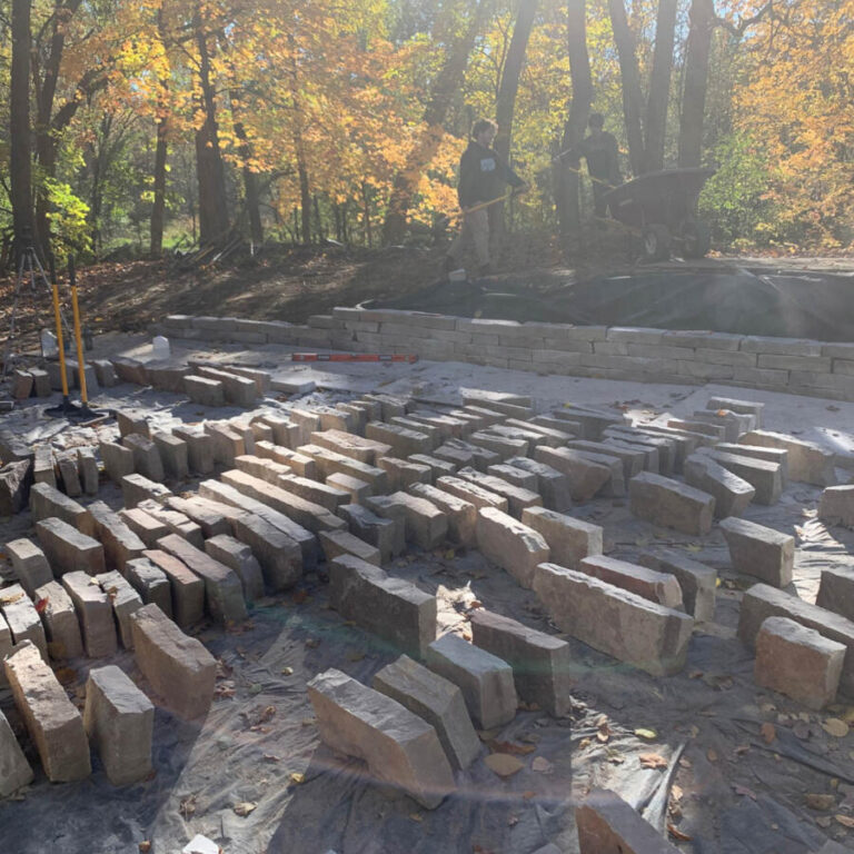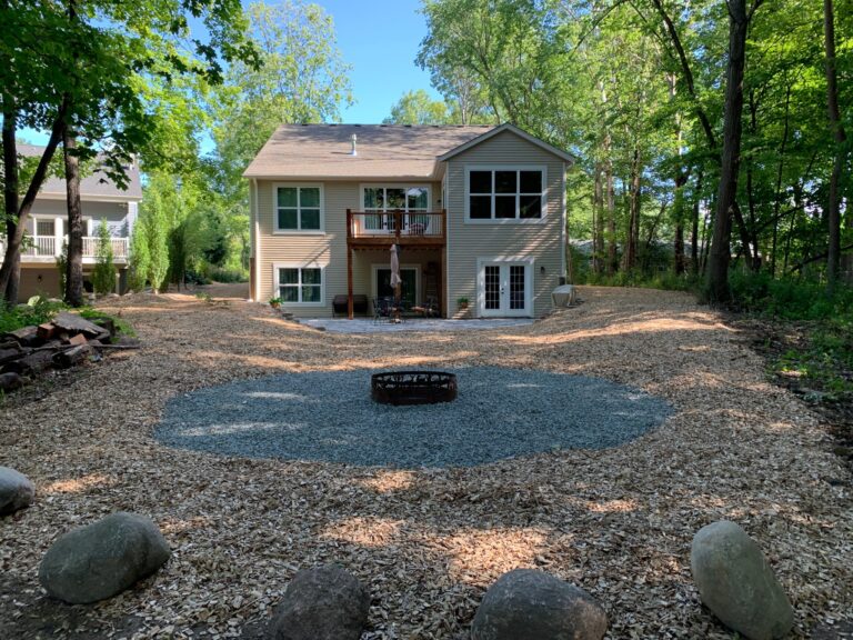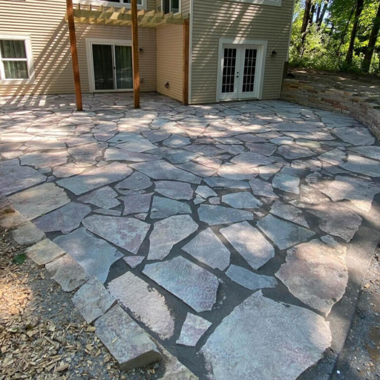 This breathtaking flagstone patio uses a mix of irregular-shaped Chilton stones to go with the sturdy Chilton dry-stack retaining walls, while tying it all together with a fire ring that offers a cozy gathering spot for friends and family to enjoy all summer long.