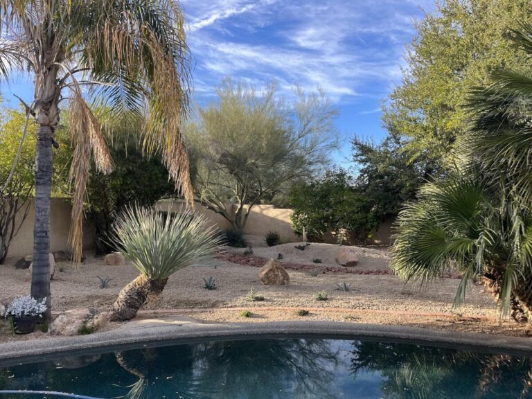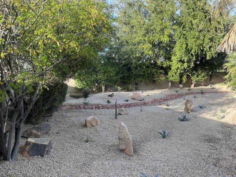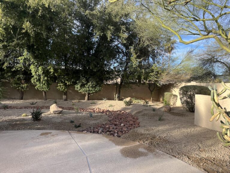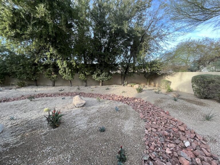 This beautifully designed xeriscape transforms the backyard into a low-maintenance desert oasis. Featuring a mix of drought-tolerant plants, natural rock accents, and thoughtful grading, this space is tailored to thrive in the Phoenix Valley’s arid climate. The clean lines and sustainable design create a peaceful environment that combines functionality with aesthetic appeal, perfect for enjoying year-round.