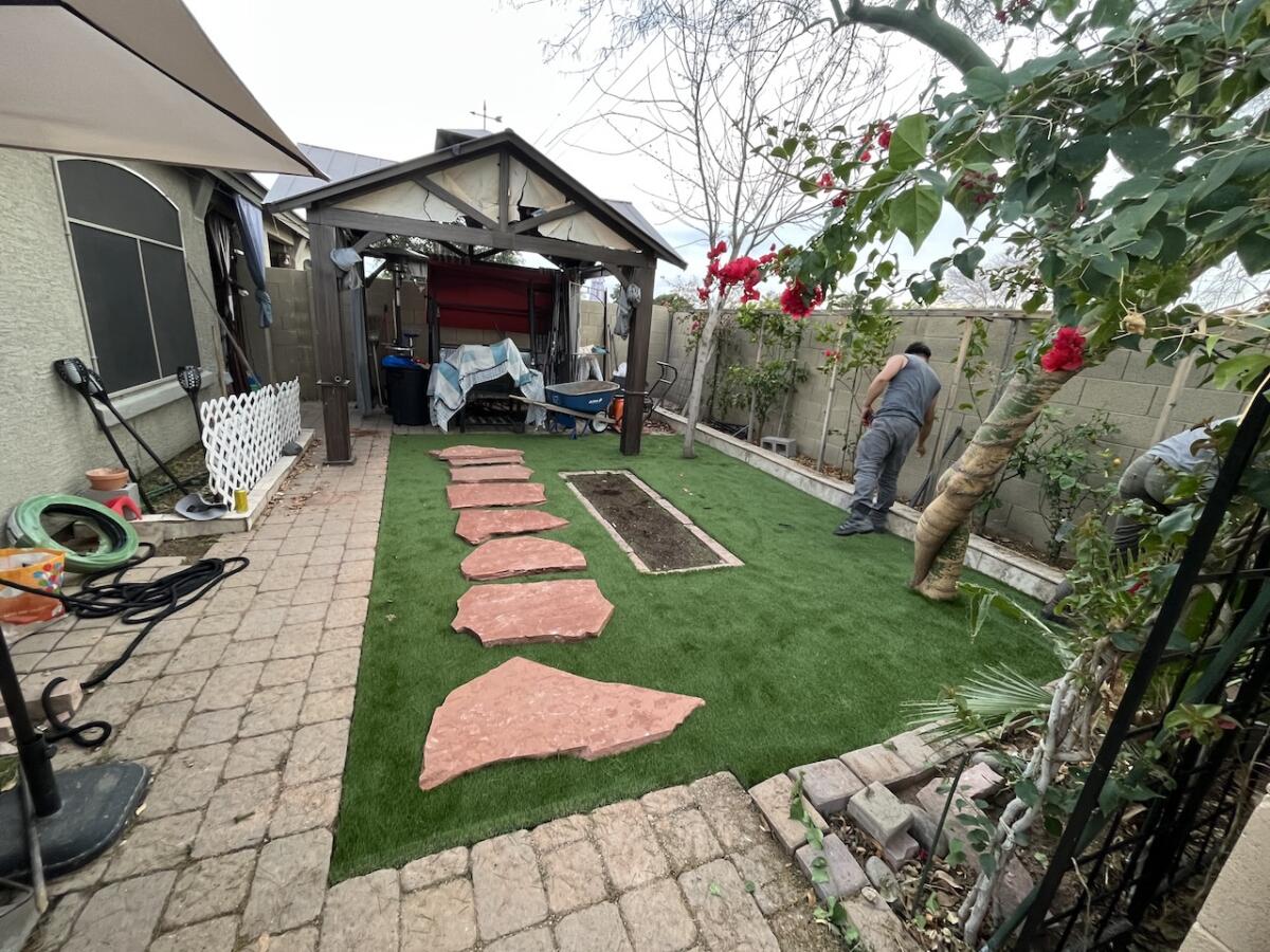 We transformed this desert landscape with lush, green artificial turf that looks and feels like real grass, without the hassle of watering, mowing or maintenance. We also added a new driveway, fresh rock, and dependable irrigation; giving this AirBnb the refresh needed to look superb for future guests.